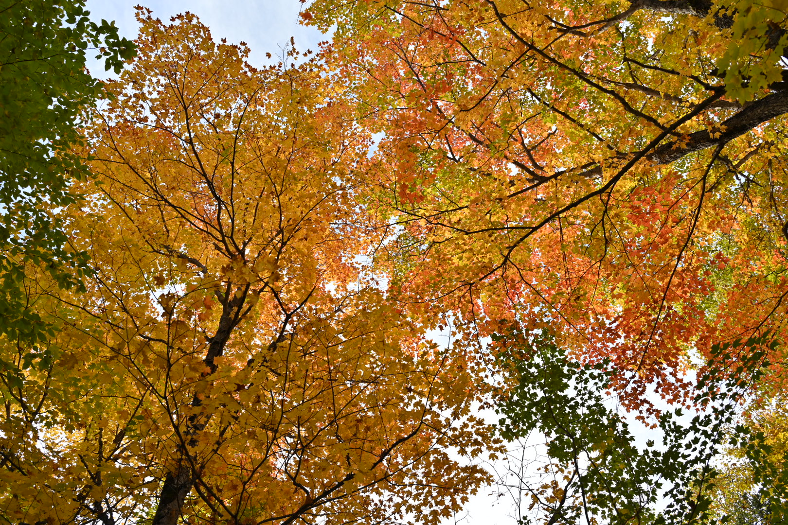 We carried on down to Parc national de la Jacques-Cartier (Quebec provincial park) where we found the area awash in yellows and oranges. We checked in at the visitor center and found the campsite was full but as we were self contained we could camp in the parking lot for a fee. We did lunch, then an 11km hike up to the escarpment, about 320m elevation gain, where we came to realize that we weren't as fit as we thought we were. That said, Pete was dragging too so the breaks to catch our breath wasn't a problem. The viewing platform up on the escarpment had a view of the parking lot, river valley and orange hills so the effort was well worth while for the view.