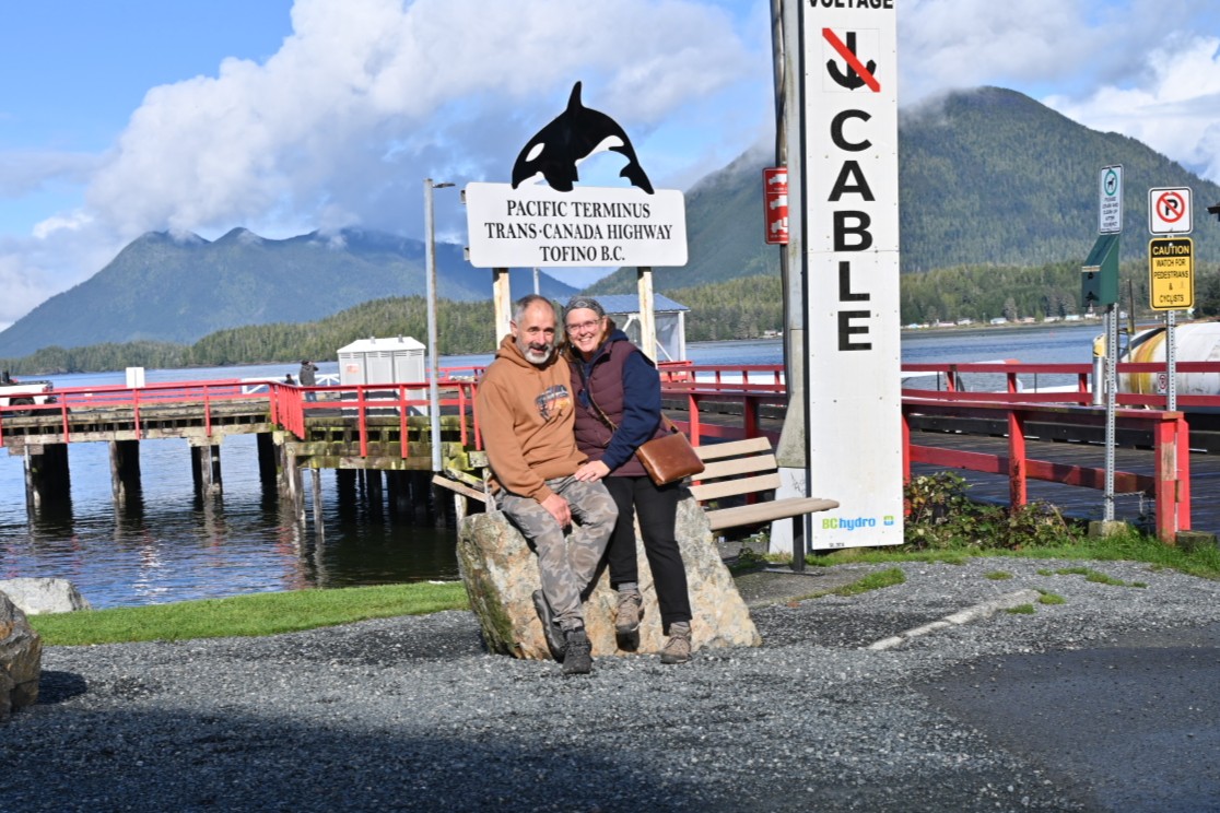We called it a day and headed towards Tofino for our campsite at Bella Pacifica. It was wet and windy but we were done for the day. Come morning the clouds parted and we had a sunny day with little wind so a morning walk on McKenzie Beach for us and a good run for Pete was a good start to the day. We played tourist and wandered into Tofino. We reached the "end" of the Pacific side of the  Trans Canada highway officially completing our coast to coast adventure. We still have a few days left, so we will keep with the wandering plan!