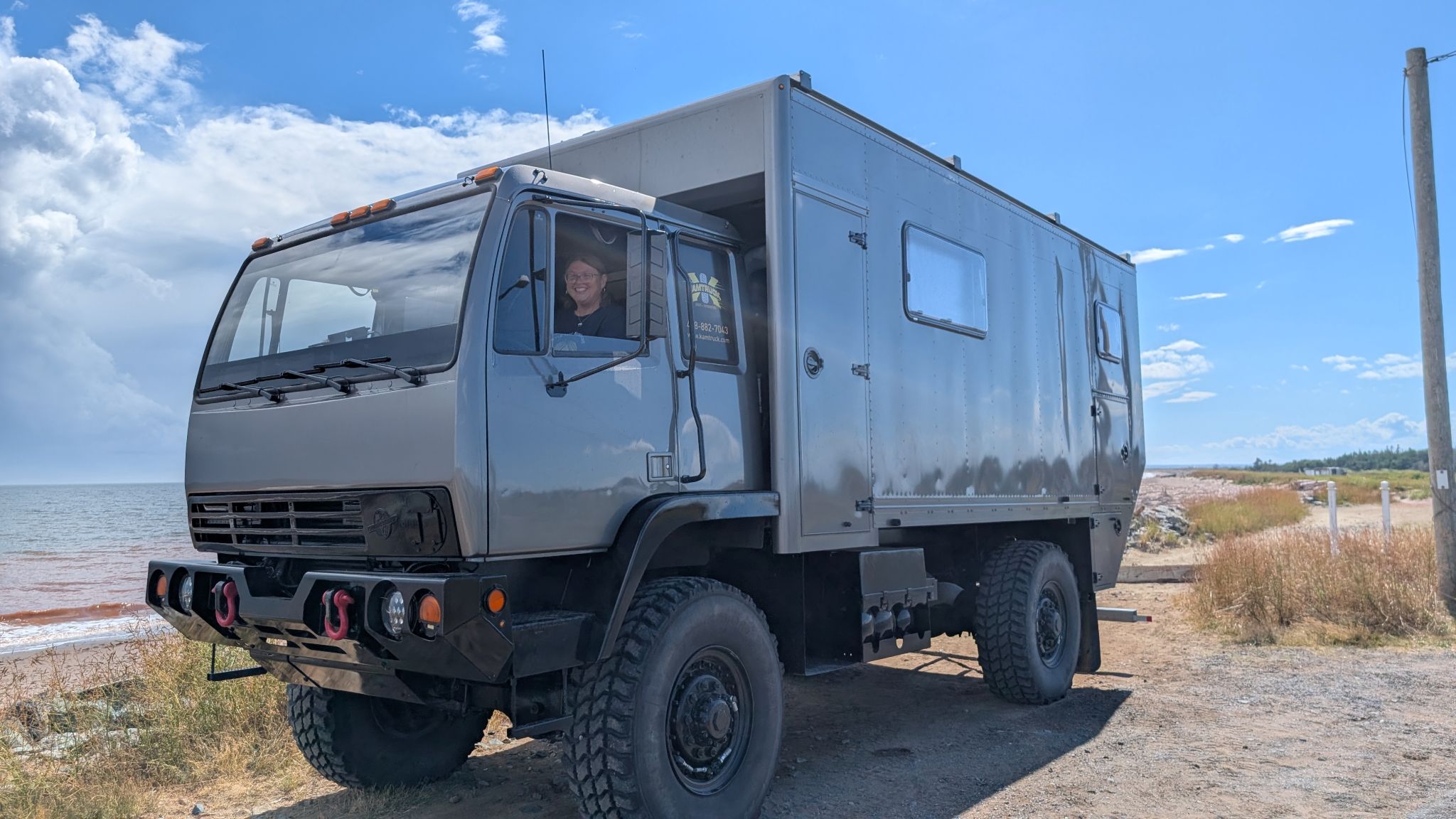 Today was a wandering day. We headed up to the lighthouse at Miscou Island and found ourselves a coffee and blueberry pastry. The day took a turn for the better though rain clouds were never very far away. We met some interesting people today. The first was a guy that repairs old cameras and has 3D printed a mechanism to attach to a kite to allow him to do drone-like photography. The second was a fellow who sources and upfits specialty trucks; things like a military troop carrier that he brought in from the States and has done an RV upfit that puts our van to shame.